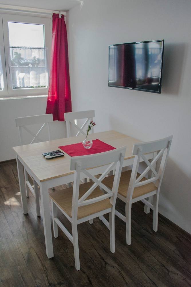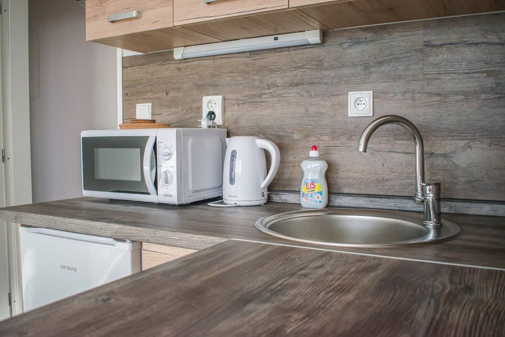 Kuchyně je plně vybavena nádobím, rychlovarnou konvicí, lednicí, mikrovlnou troubou a indukční plotýnkou. Dále TV a WiFi připojení.