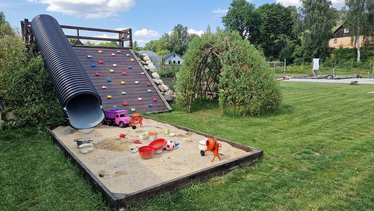 V obývacím pokoji je televize, pohodlná veliká sedačka, vybavený dětský koutek na hraní, stoleček se židličkami na kreslení, hrací koberec na autíčka. Je zde i veliký rozkládací jídelní stůl.