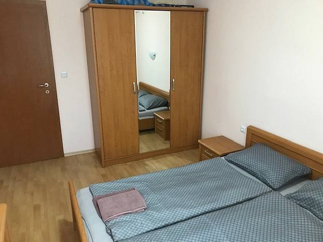 Apartmán v 1.patře, předsíň, 2 ložnice (1x 2lůžko, 2x 1lůžko), obývací pokoj s kuchyňským koutem a rozkládací pohovkou.