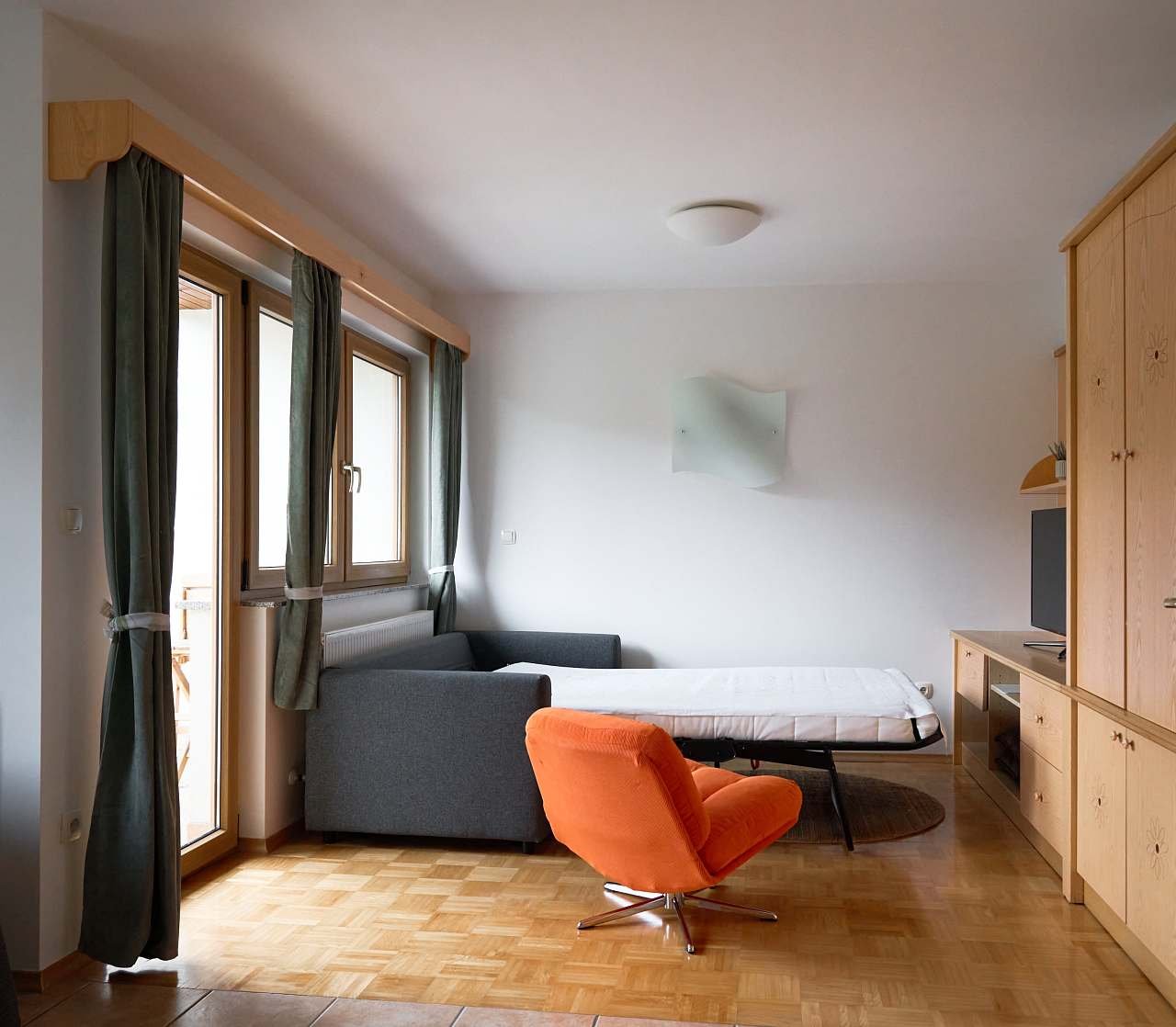 V apartmánu je ložnice, kuchyň a obývací pokoj s velkou rozkládací sedací soupravou a přístupem na balkon.