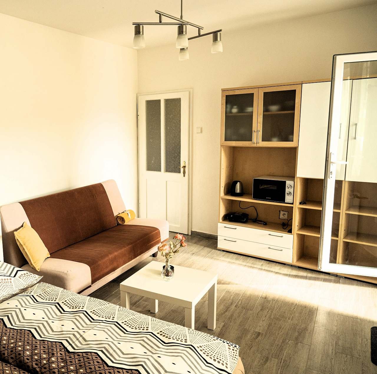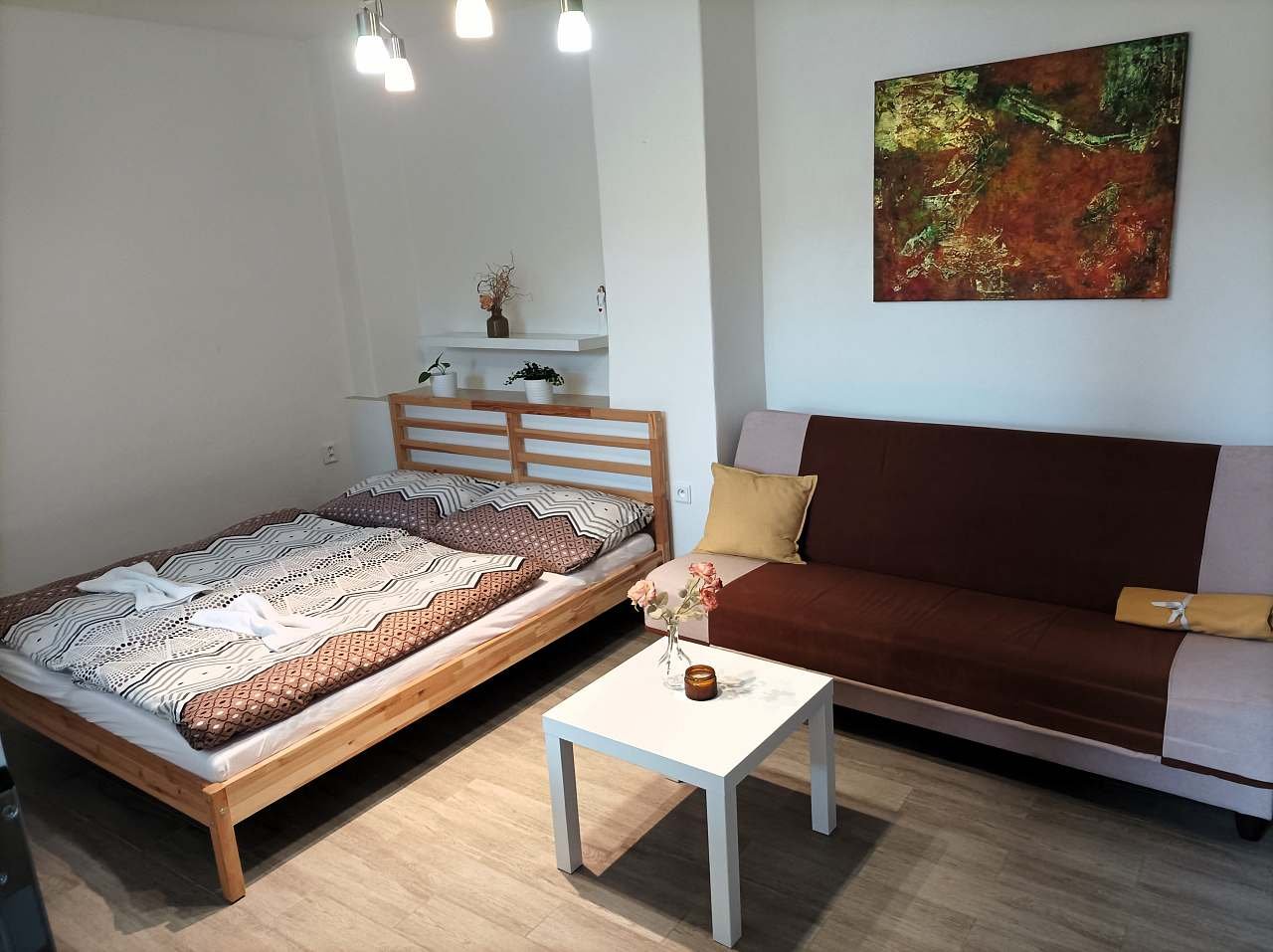 Studio s manželskou postelí, rozkládací sedací soupravou a sociálním zařízením.