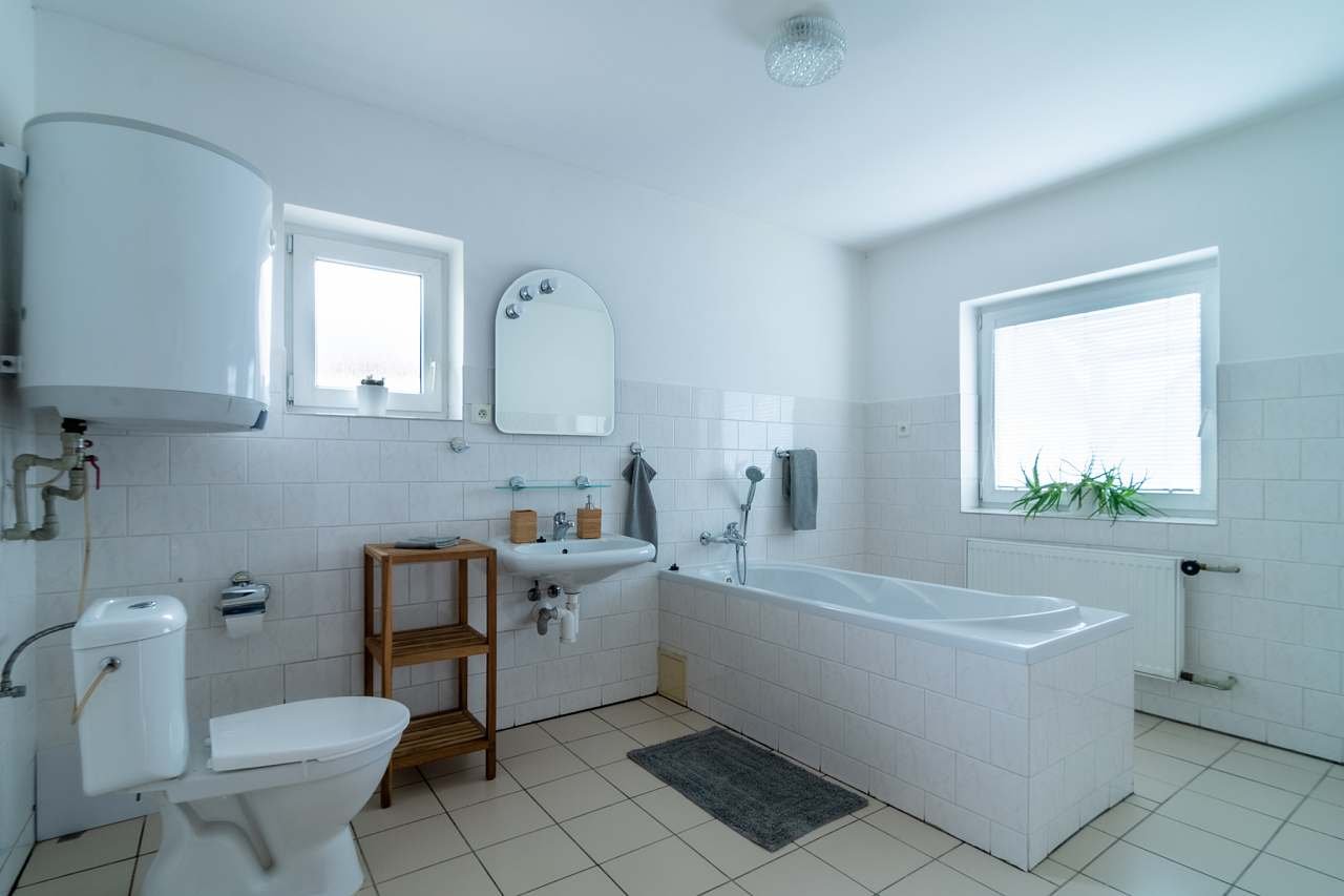 Prostorná koupelna s vanou a WC, ohřev teplé vody je zde el. bojlerem o velikosti 80 L.