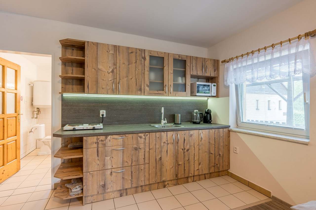 Nový kuchyňský kout je vybaven k vaření elektrickým dvouplotýnkovým vařičem, mikrovlnou troubou, vším potřebným k vaření a vestavěnou lednicí.