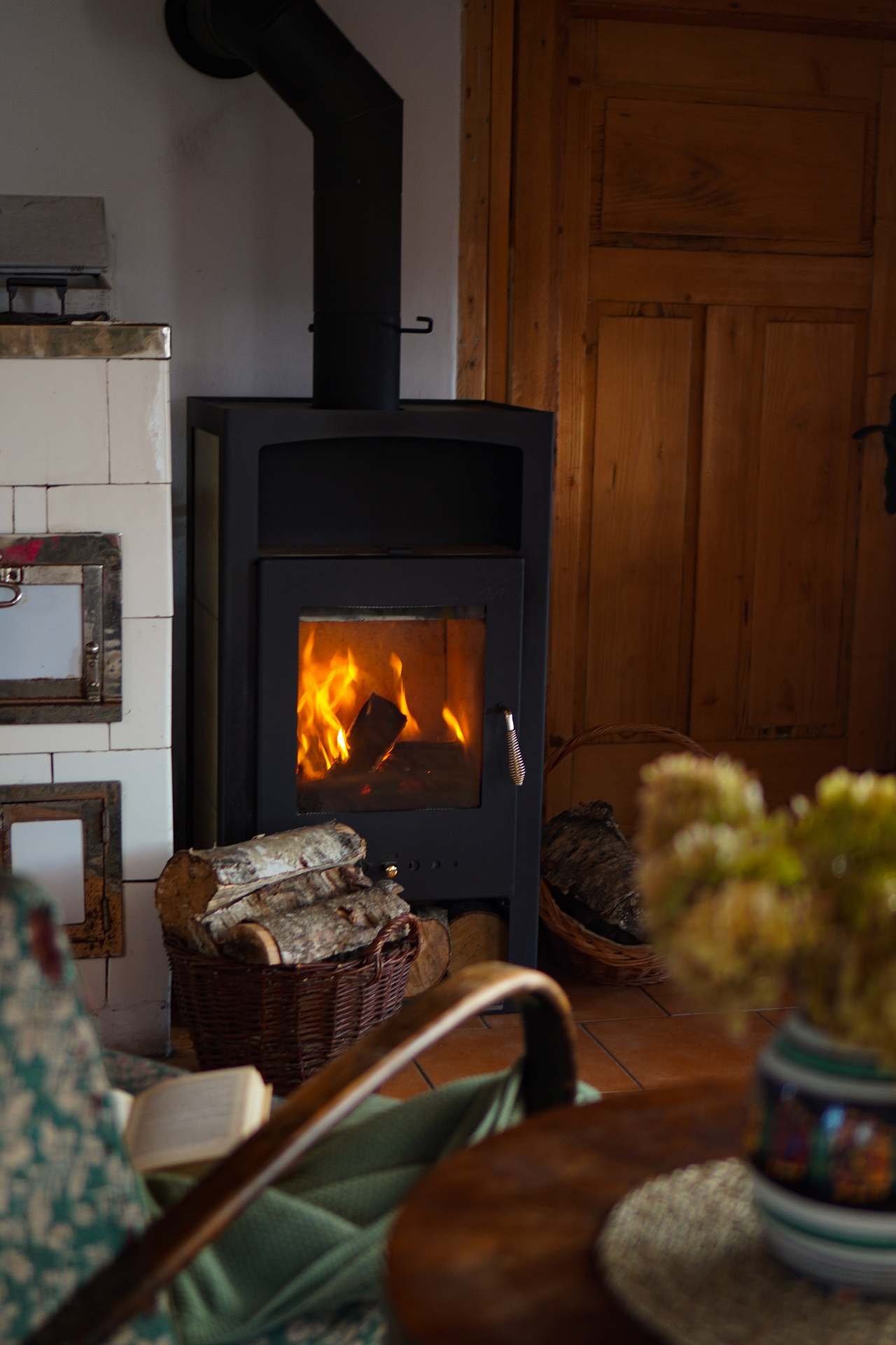 Elektrický kotel zajišťuje efektivní vytápění, zatímco krbová kamna s výměníkem přinášejí do prostoru atmosféru útulného domova.