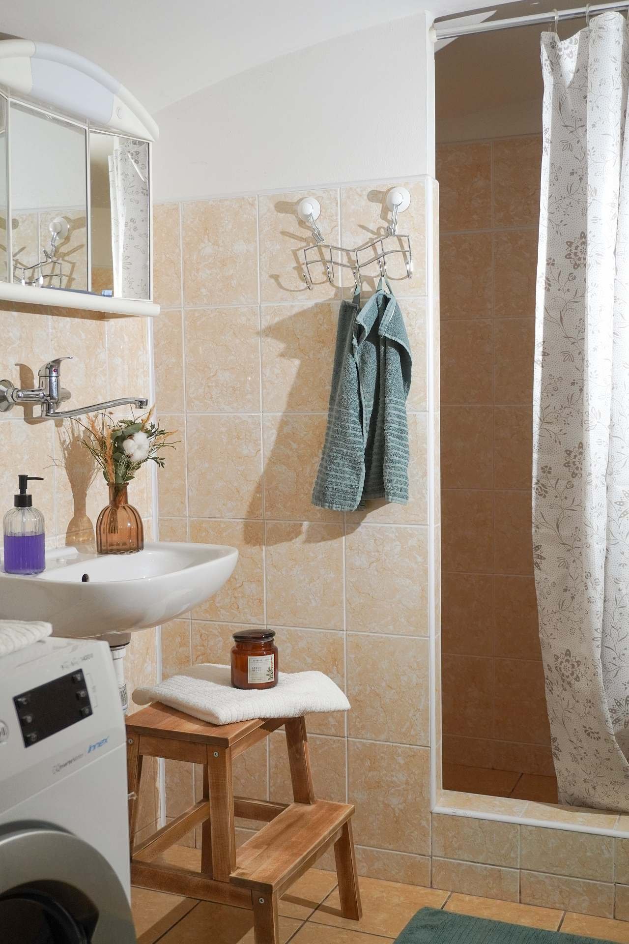 Koupelna je vybavena sprchovým koutem, umyvadlem, WC a praktickou pračkou se sušičkou. Fén k dispozici.