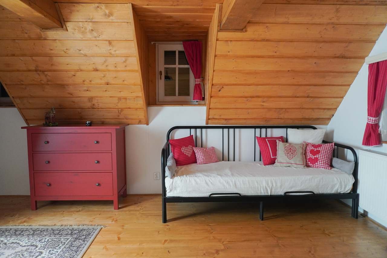 Chalupa nabízí pohodlné ubytování pro vaši rodinu či skupinu přátel. Čistá a útulná ložnice s kapacitou 6 osob je připravena pro váš odpočinek. Možnost přistýlky až pro 2 osoby v přilehlé pracovně. Pro nejmenší členy vaší skupiny máme připravenou dětskou postýlku.