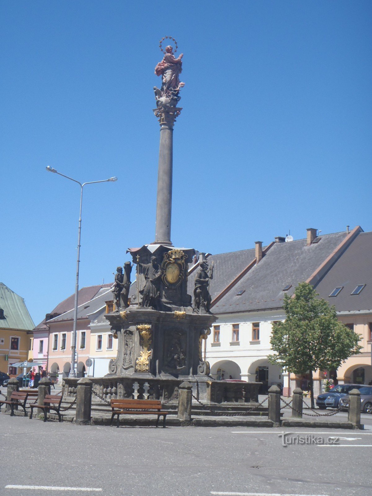 Na vrcholu sloupu je umístěná pozlacená socha Panny Marie.