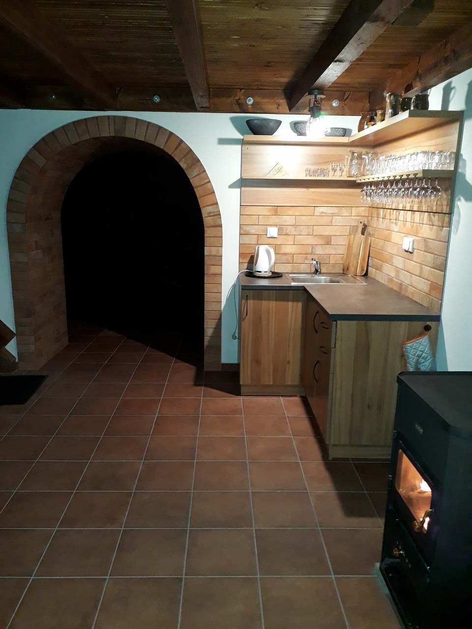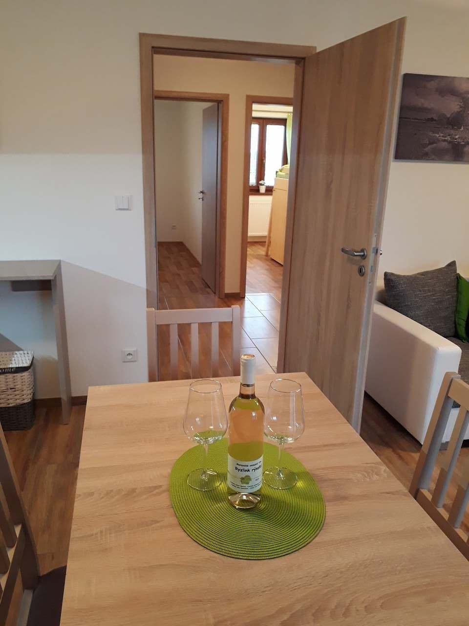 - obývací pokoj s televizí a plně vybavenou kuchyní (lednice, mikrovlnná trouba, elektrický sporák, trouba, varná konvice, jídelní stůl), vinotéka. V obývacím pokoji je k dispozici rozkládací sedací souprava pro přespání 2 osob (přistýlka).