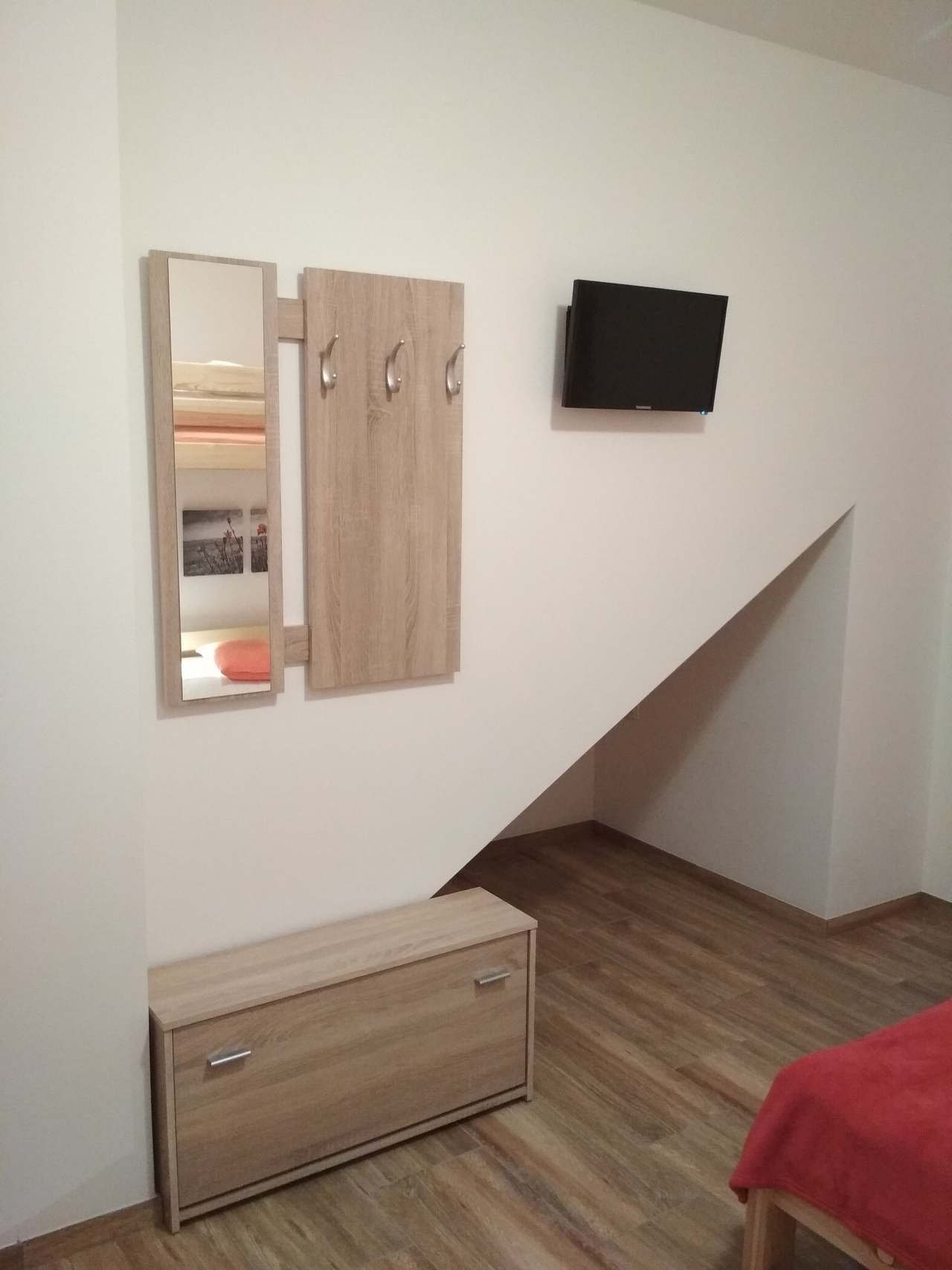 1) Přízemí: pokoj pro 3 osoby - manželská postel + postel (horní spaní), šatní skříň, jídelní stůl, lednička, mikrovlnná trouba, varná konvice, televize.