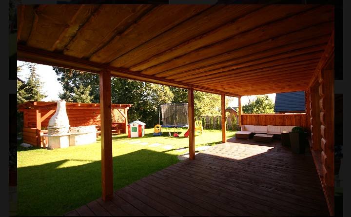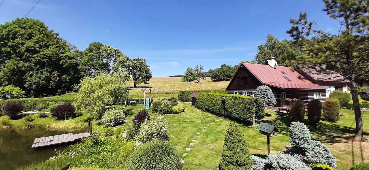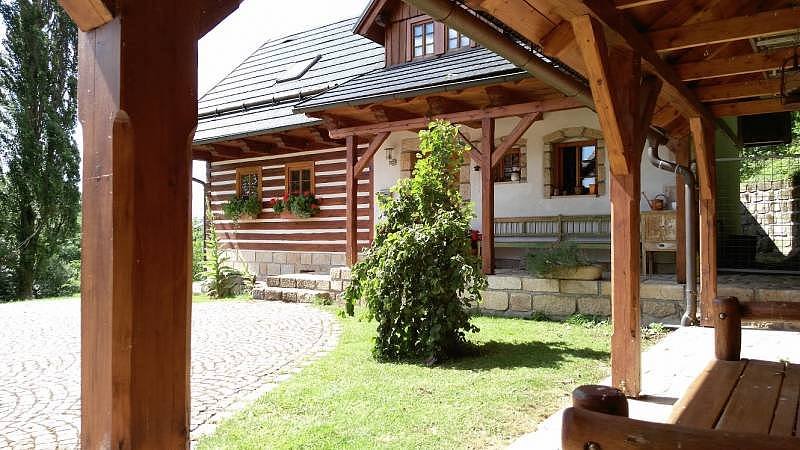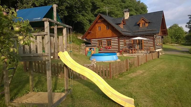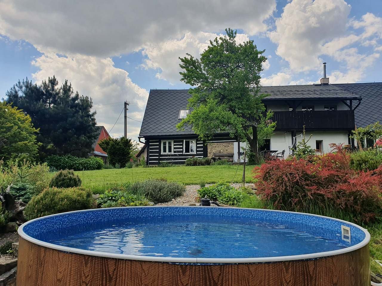 Roubená chalupa s částečně uzavřenou pergolou, krbem, posezení. Prostorná zahrada a dvůr, bazén 3,6x0,9 s pískovou filtrací. Houpačka 2x, trampolína, také závěsná síť, pískoviště...