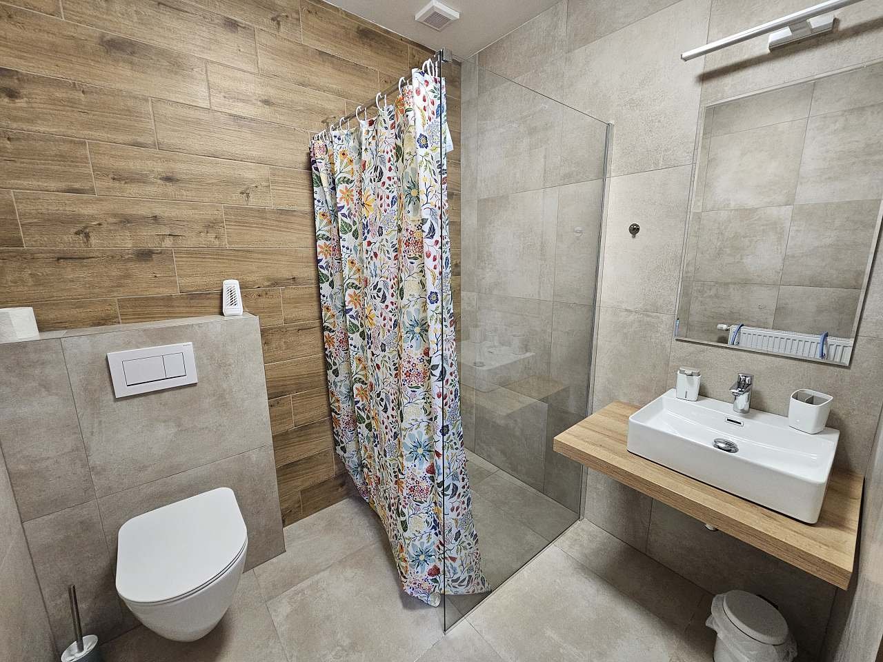 Každý pokoj má vlastní koupelnu se sprchovým koutem a toaletou.