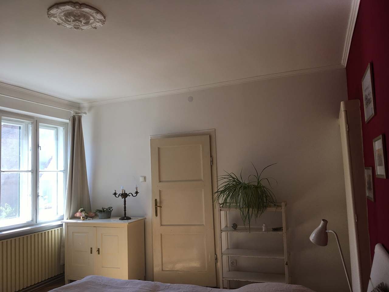 Hlavní ložnice s manželskou postelí pro 2 osoby. Vchod z ní přímo do sousedící koupelny s umyvadlem a vanou. Výhled do dvora a na Ditrichštejsnkou hrobku.