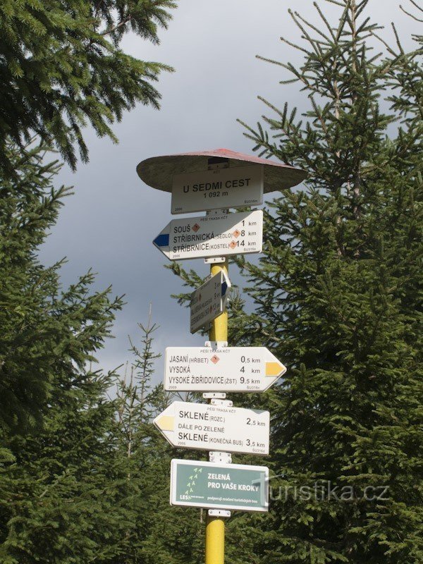 U Sedmi cest. Dříve se toto rozcestí nazývalo U Čtyř rohů, ale již dávno to není skutečností. Alespoň co se turistického značení týče. Novější pojmenování rozcestí je daleko výstižnější, skutečně, když se rozhlédneme, sedm cest tu skutečně najdeme (i když v několika případech jsou to spíš pěšiny). Kříží se tu dvě turistické značky, modrá a žlutá. Modrá vede od Vojtíškova a je to vlastně…