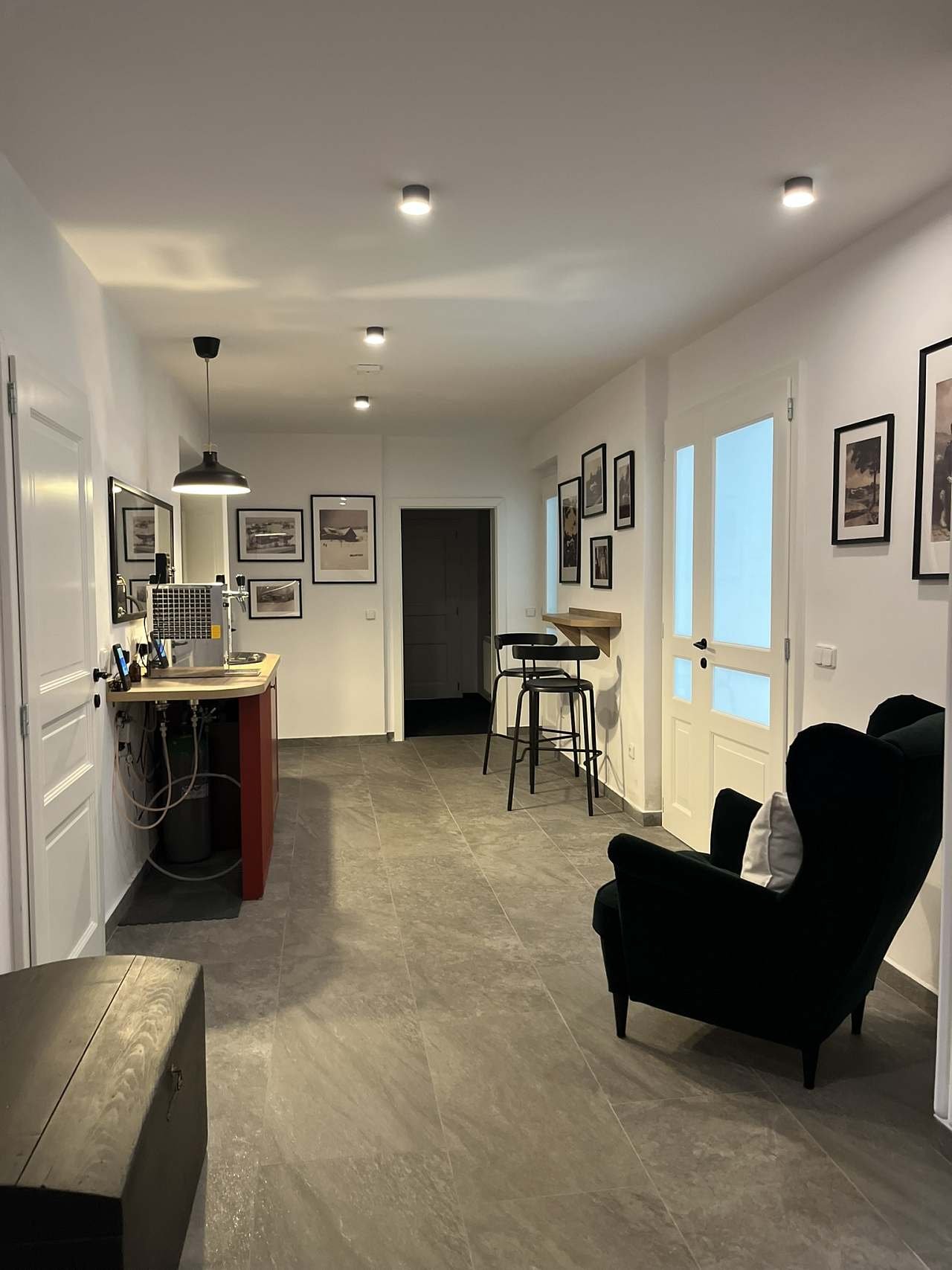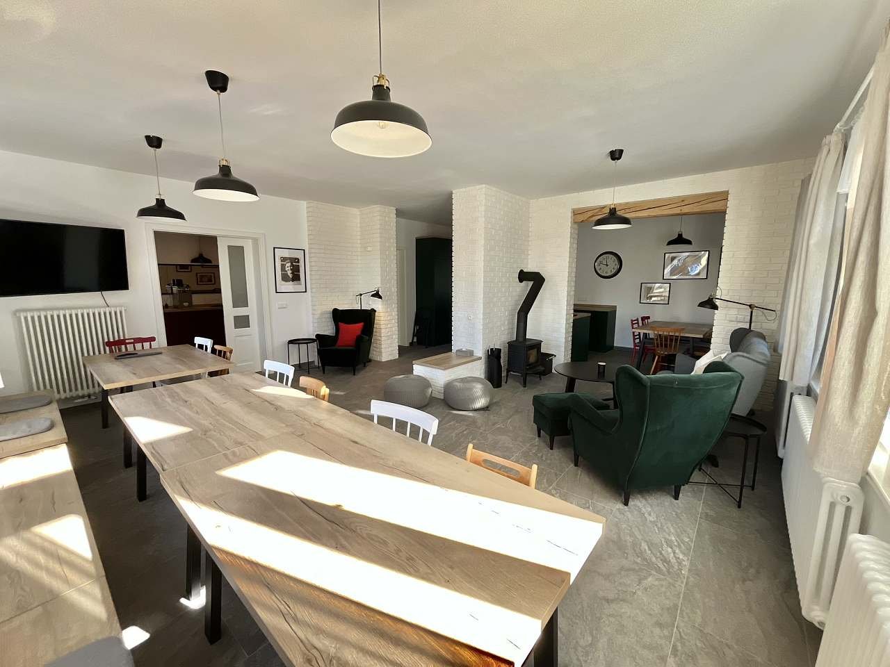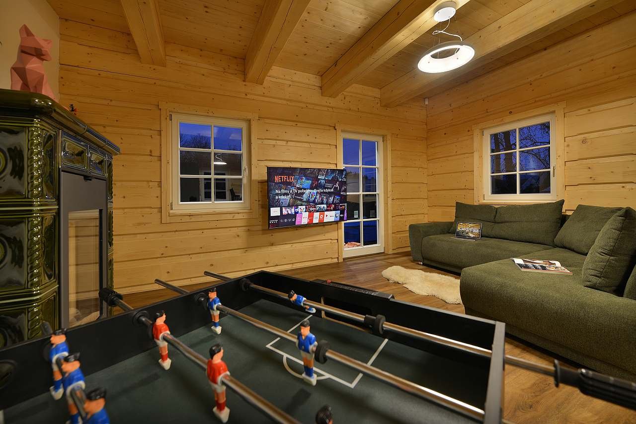 Objekt je kompletně vybaven pro pobyt většího množství lidí. K dispozici je prostorná kuchyně (sporák, mikrovlnka, dvě myčky, digestoř, kávovar, rychlovarná konvice, příbory, nádobí, drobný inventář). Prostorná síň je zobytněna a vybavena dvoukohoutovou pípou, pultíkem pro posezení na barových stoličkách, kuřáckým koutkem.