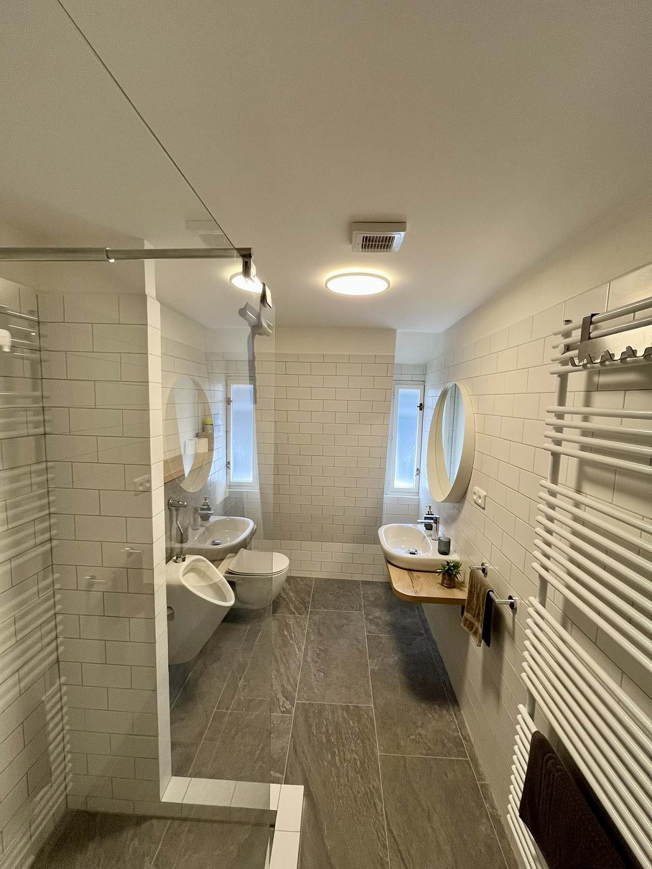 Apartmány a pokoj číslo 1 mají samostatné prostorné koupelny s WC a sprchovým koutem. Pro ostatní pokoje jsou společné čtyři koupelny v patře s WC a prostorným sprchovým koutem, dvě z koupelen jsou doplněny urinály.