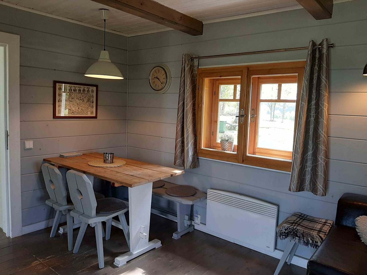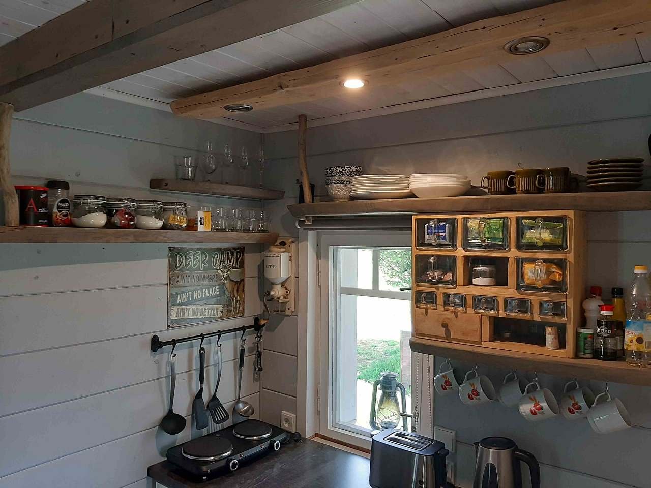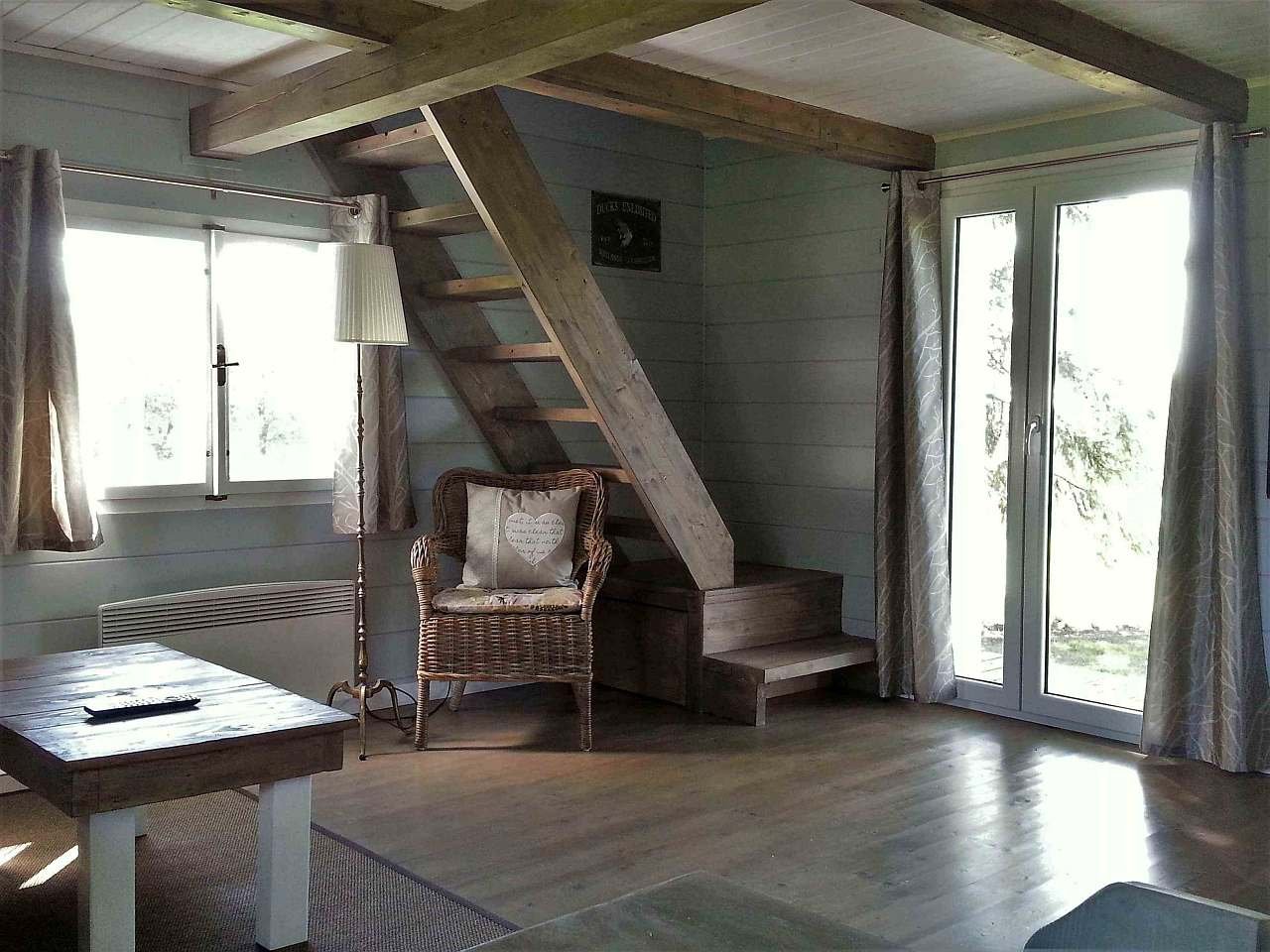 Ve spodním patře je obývák spojen s kuchyní. Krbová kamna jsou přímo v obýváku. V horním patře je ložnice s manželskou postelí a separé dětská ložnice se dvěma postelemi. Na toaletu se dostanete z chodbičky.
