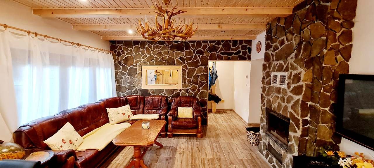 Obývacia miestnosť s krbom, koženou sedačkou, minibarom, televízorom s optickým pripojením, wifi, rádio či bluetooth reproduktor pre zábavu. Kuchynská časť plne vybavená: chladnička, mraznička, teplovzdušná rúra, indukčná varná doska, umývačka, mikrovlnka, kávovar, toustovač, rýchlovarná konvica, vinotéka atď.. 2x krb, Detská herňa s kalčetom, stolnými hrami, hračkami, miniknižnicou.