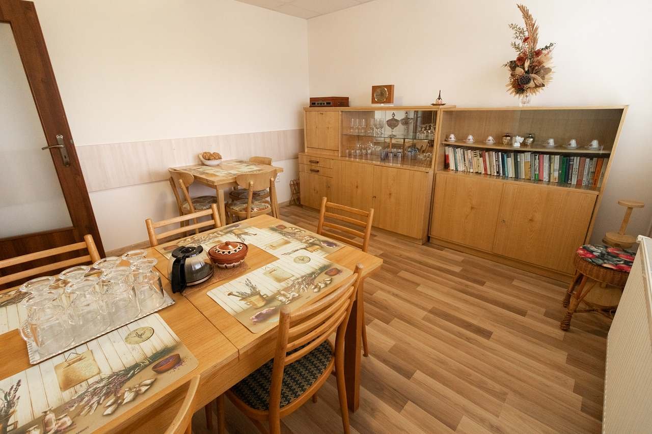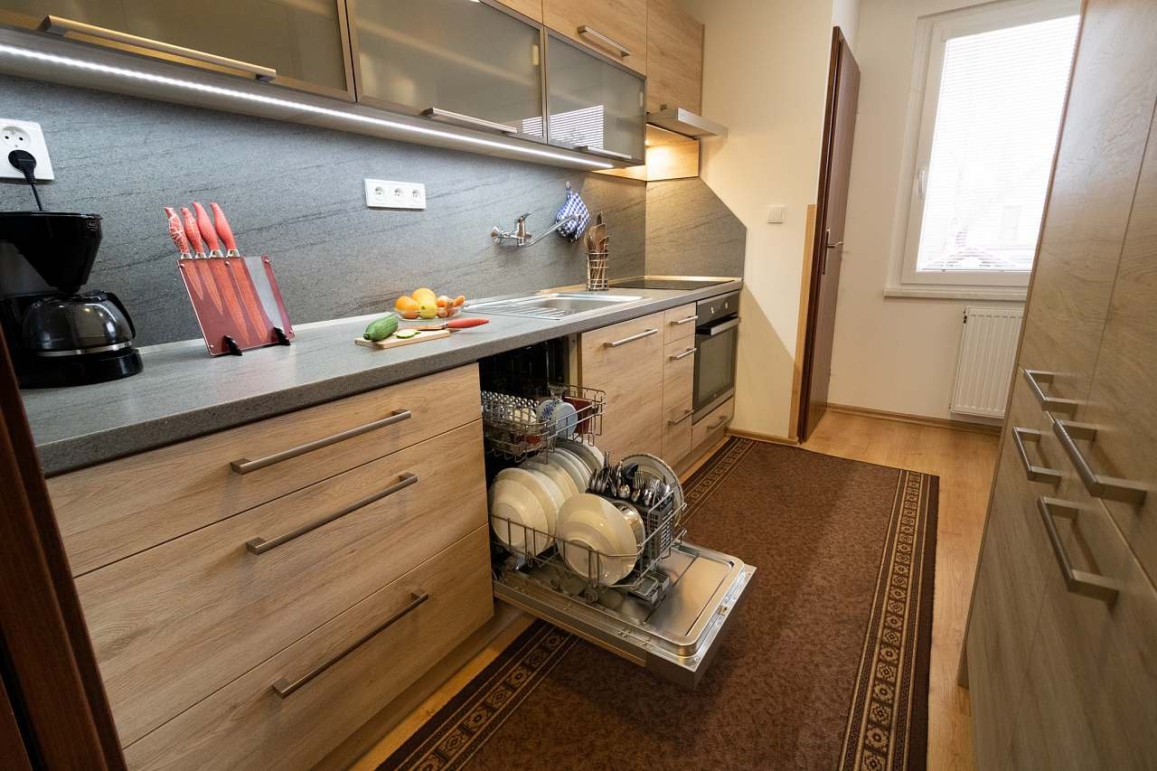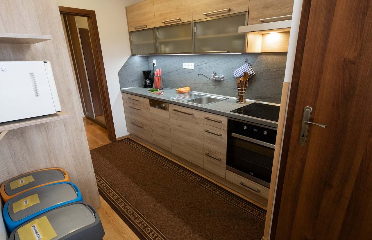 Kuchyně je vybavena veškerým inventářem, ledničkou s mrazákem, myčkou, sporákem se sklo - keramickou deskou, varnou konvicí, mikrovlnnou a elektrickou troubou. V obývacím pokoji je umístěna televize se dvěma gauči a taburety pro 10 osob. Vedle obývacího pokoje s balkónem je jídelna taktéž s kapacitou pro 10 osob.