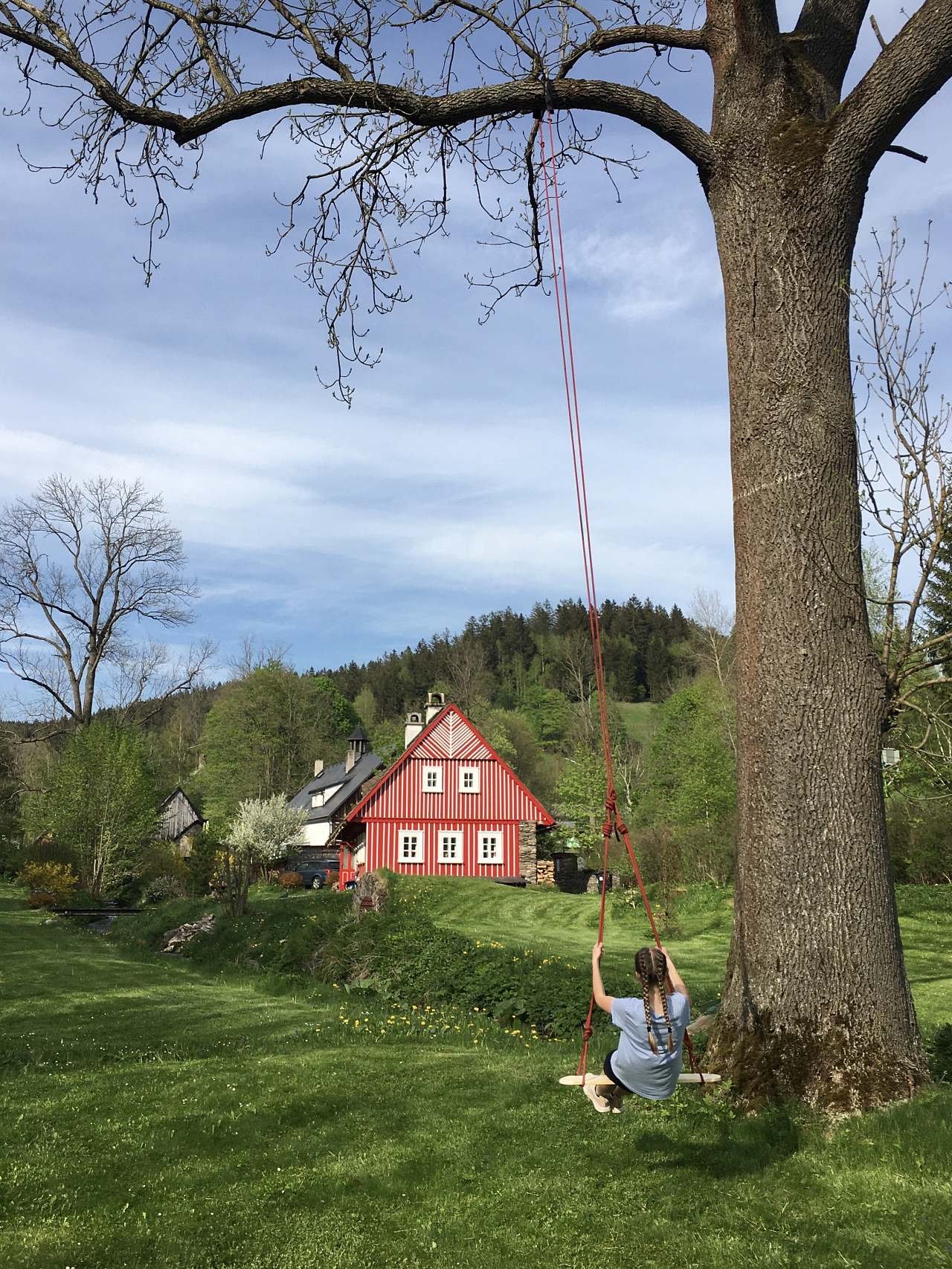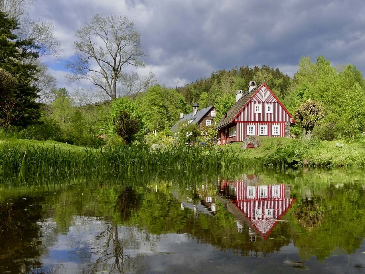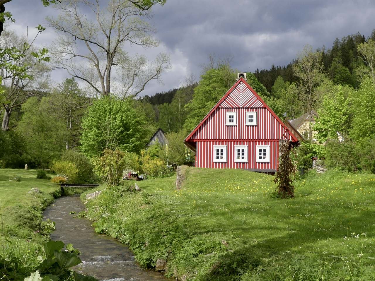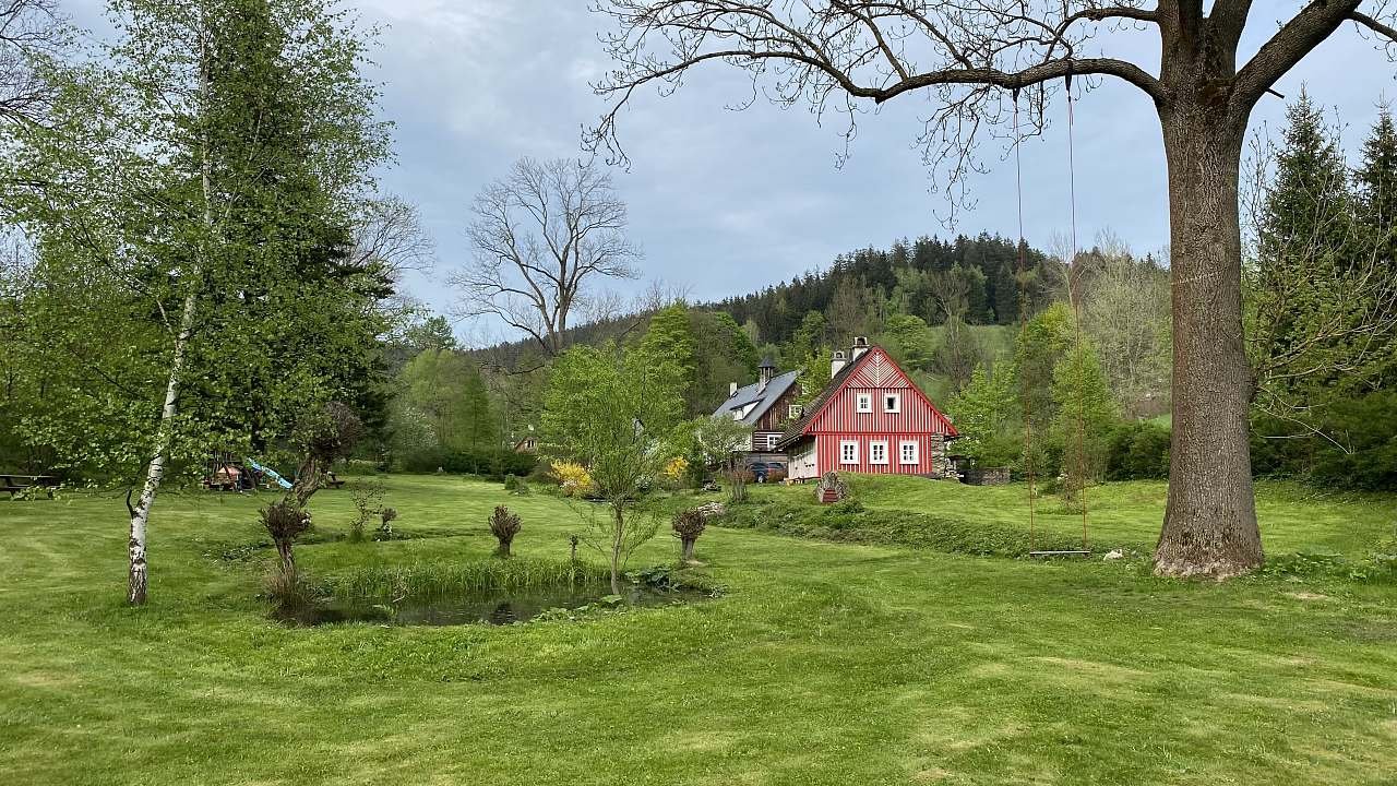 K chalupě náleží velká zahrada s potoky a jezírky. Dětem je k dispozici hřiště s pískovištěm.