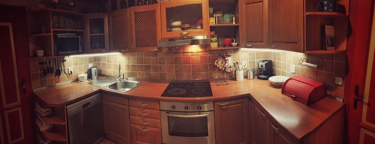 Plně vybavená kuchyň sklokeramická deska, mikrovlnná trouba, myčka, horkovzdušná trouba, topinkovač, sendvičovač, rychlovarná konvice, kávovar.