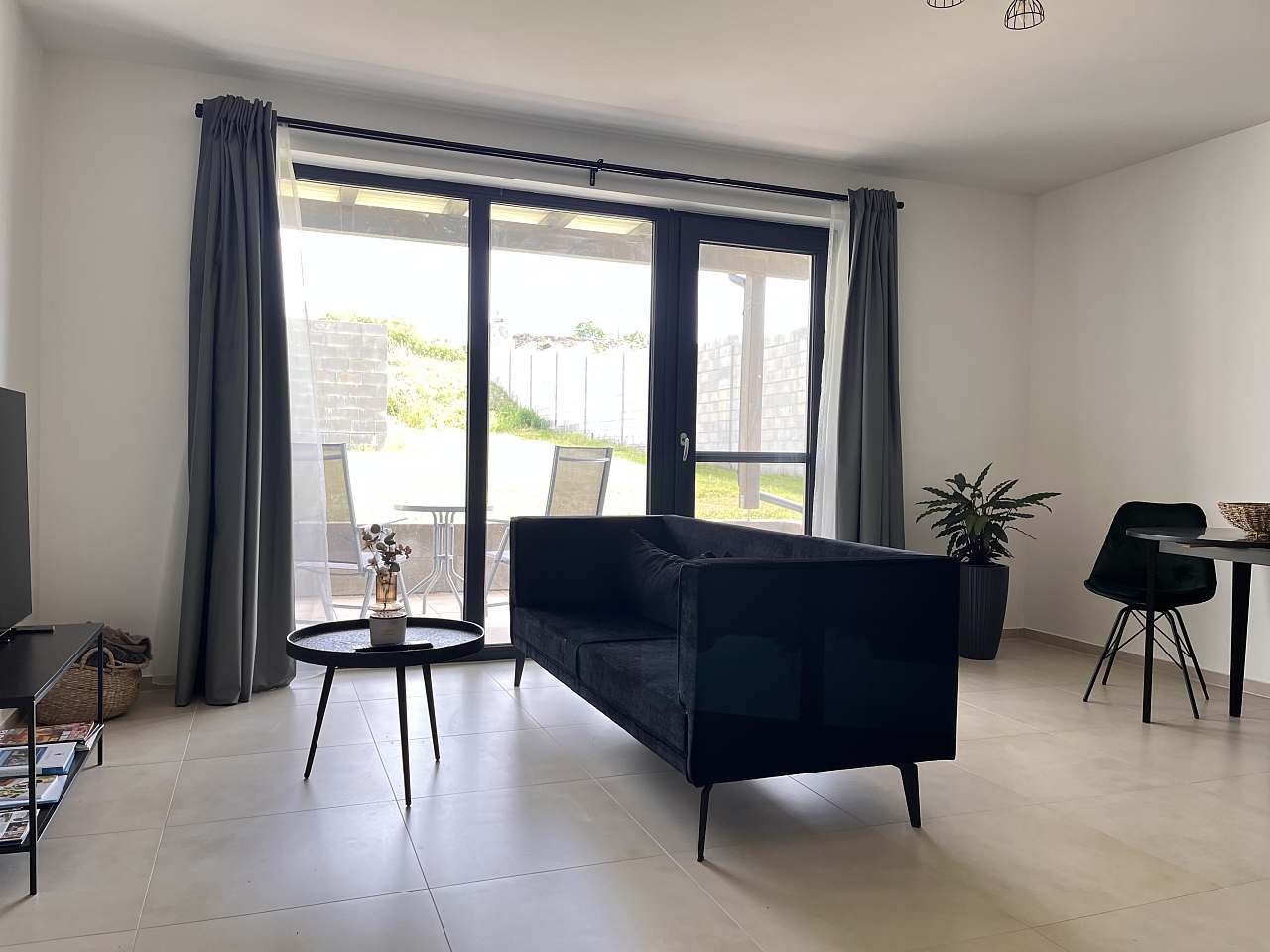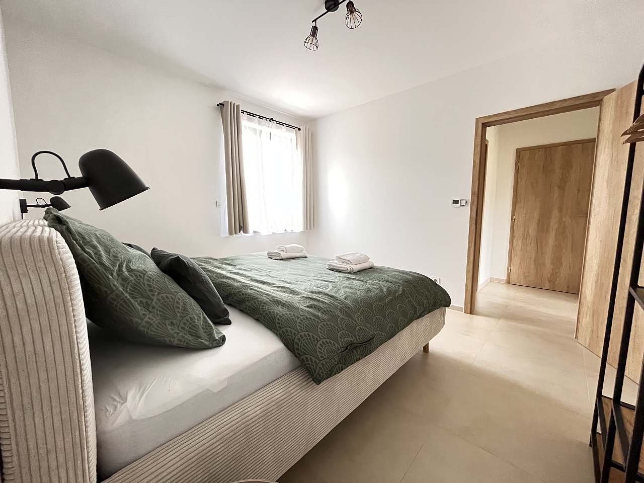 Kuchyně je spojena s jídelním koutem (stůl, 2 židle) a obývacím prostorem (pohovka, konferenční stolek, TV stolek, TV). Z obývacího prostoru vede francouzské okno (dveře) na soukromou terasu vybavenou zahradním nábytkem. V ložnici se nachází manželská postel s pružinovými matracemi vysoké kvality, noční stolky s lampami, skříň a samozřejmě kvalitní anti - alergenní lůžkoviny s povlečením. Koupelna je vybavena sprchovým koutem, toaletou a umyvadlem se zrcadlem.