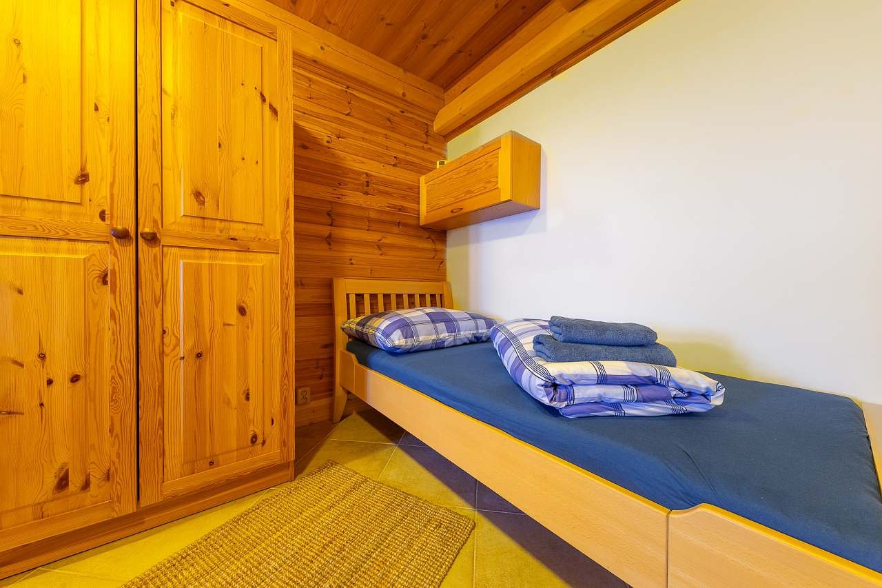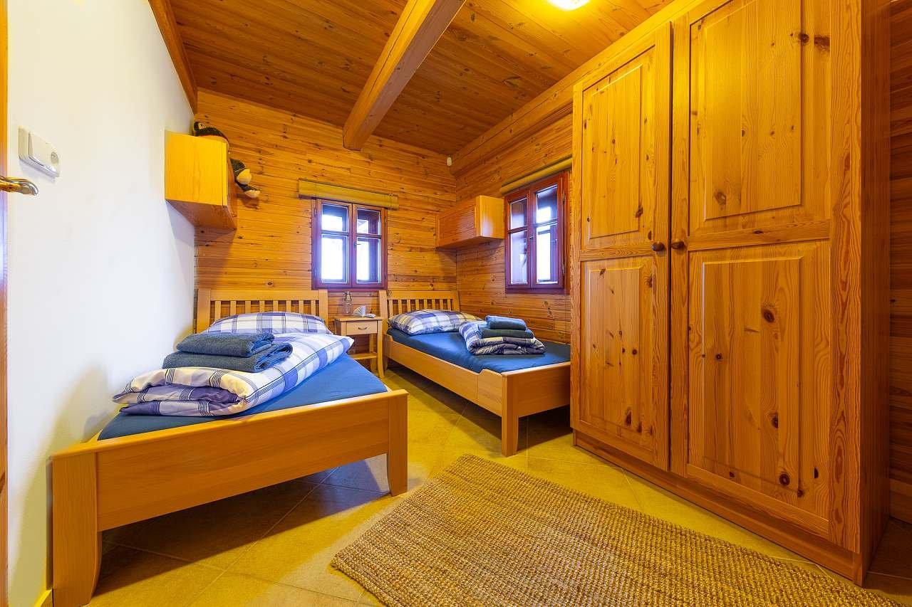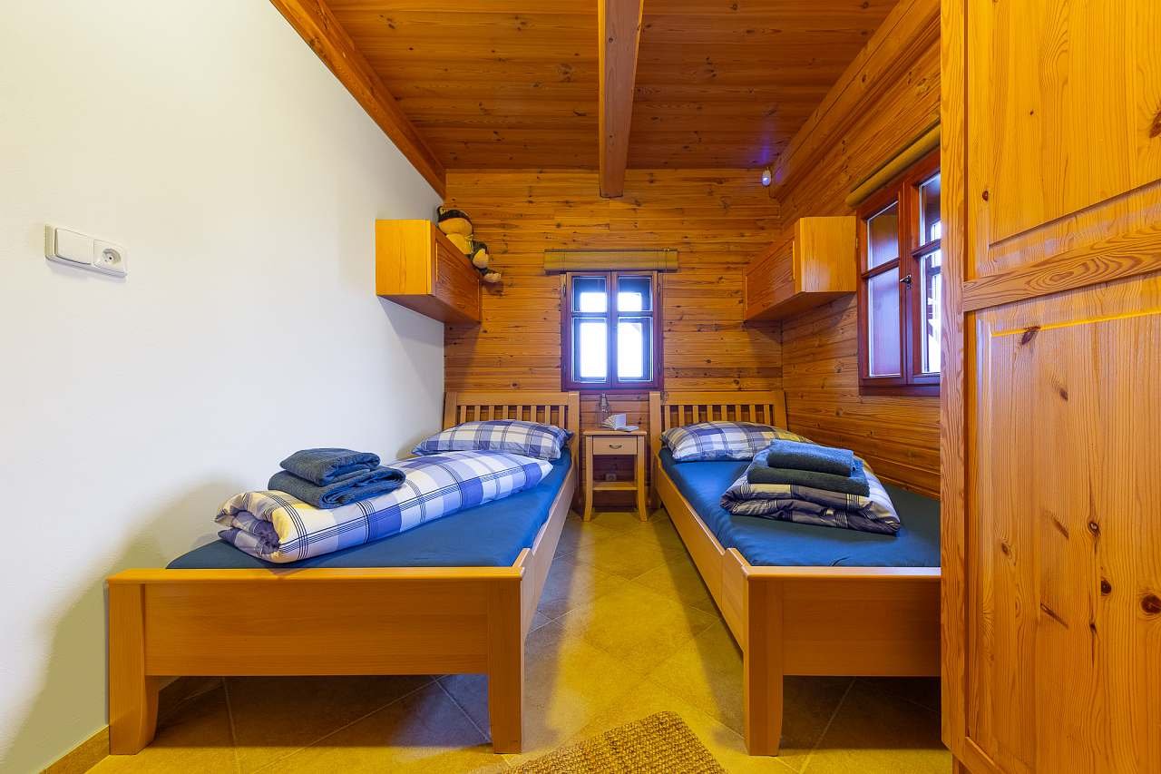 Pokoj pro hosty: Při pronájmu celé chalupy je k dispozici pokoj pro hosty s kapacitou tří osob. Celkem může být v celé chalupě ubytováno 18 osob. Ve výjimečném případě lze po dohodě předem využít rozkládací pohovku pro dvě osoby ve společenské místnosti.