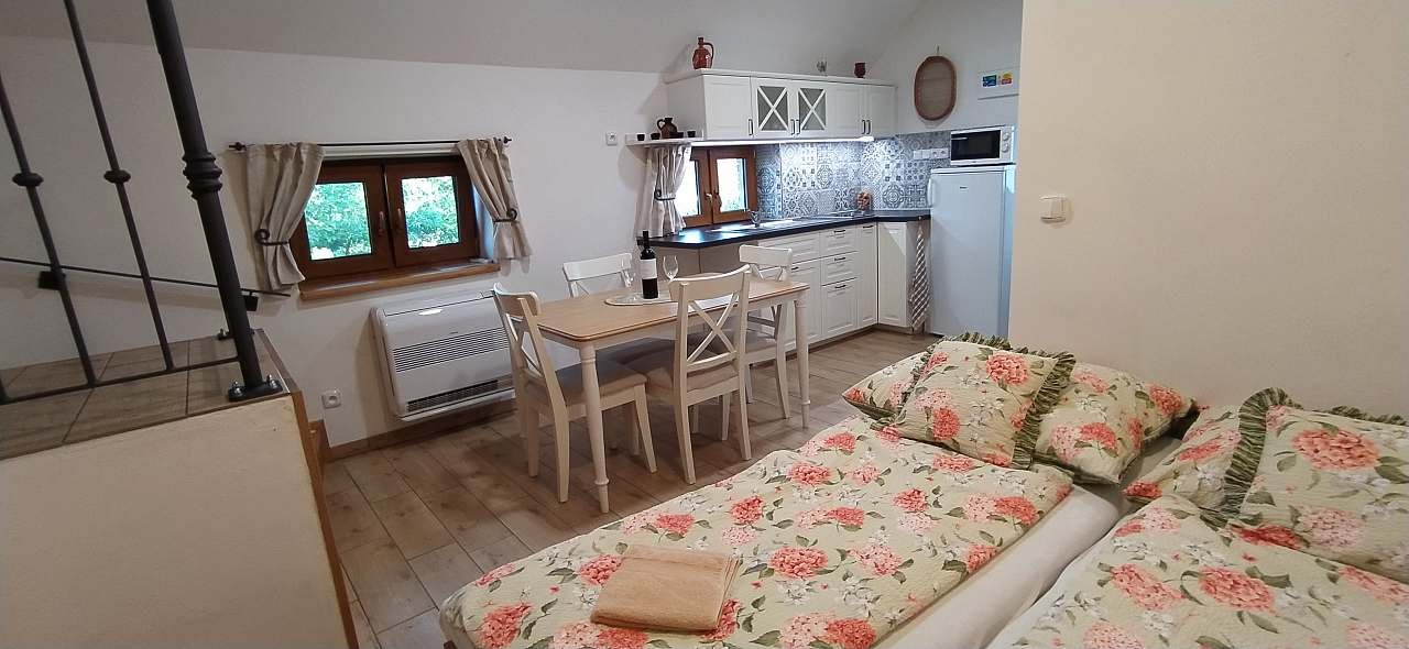 Apartmán Sýpka: plně vybavená kuchyň s lednicí, mikrovlnkou a velkým jídelním stolem, 180 cm širokým dvojlůžkem, 160 cm širokým dvoulůžkem a klimatizací.