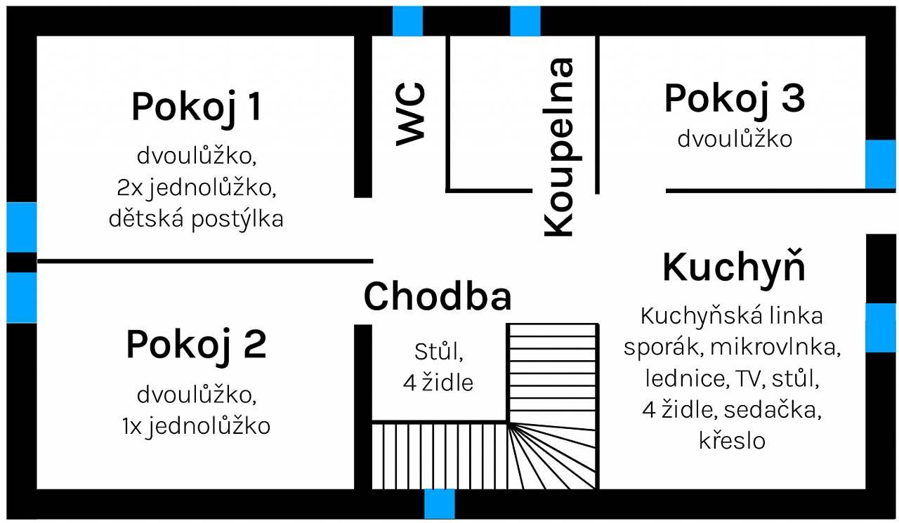 Pokoj 1: dvoulůžko, 2x jednolůžko, 1x dětská postýlka. Pokoj 2: dvoulůžko, 1x jednolůžko. Pokoj 3: dvoulůžko.