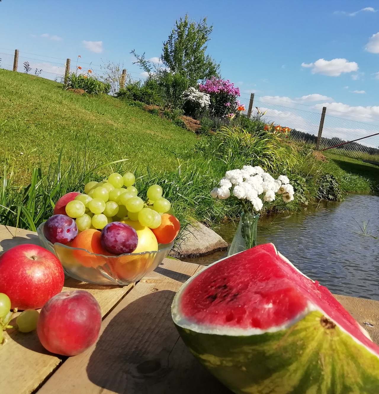 Bylinková zahrádka, pár ovocných stromů a keřů.