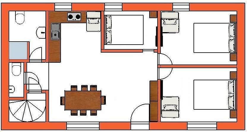 Apartmán obsahuje 3 ložnice, obývací místnost s kuchyňským koutem